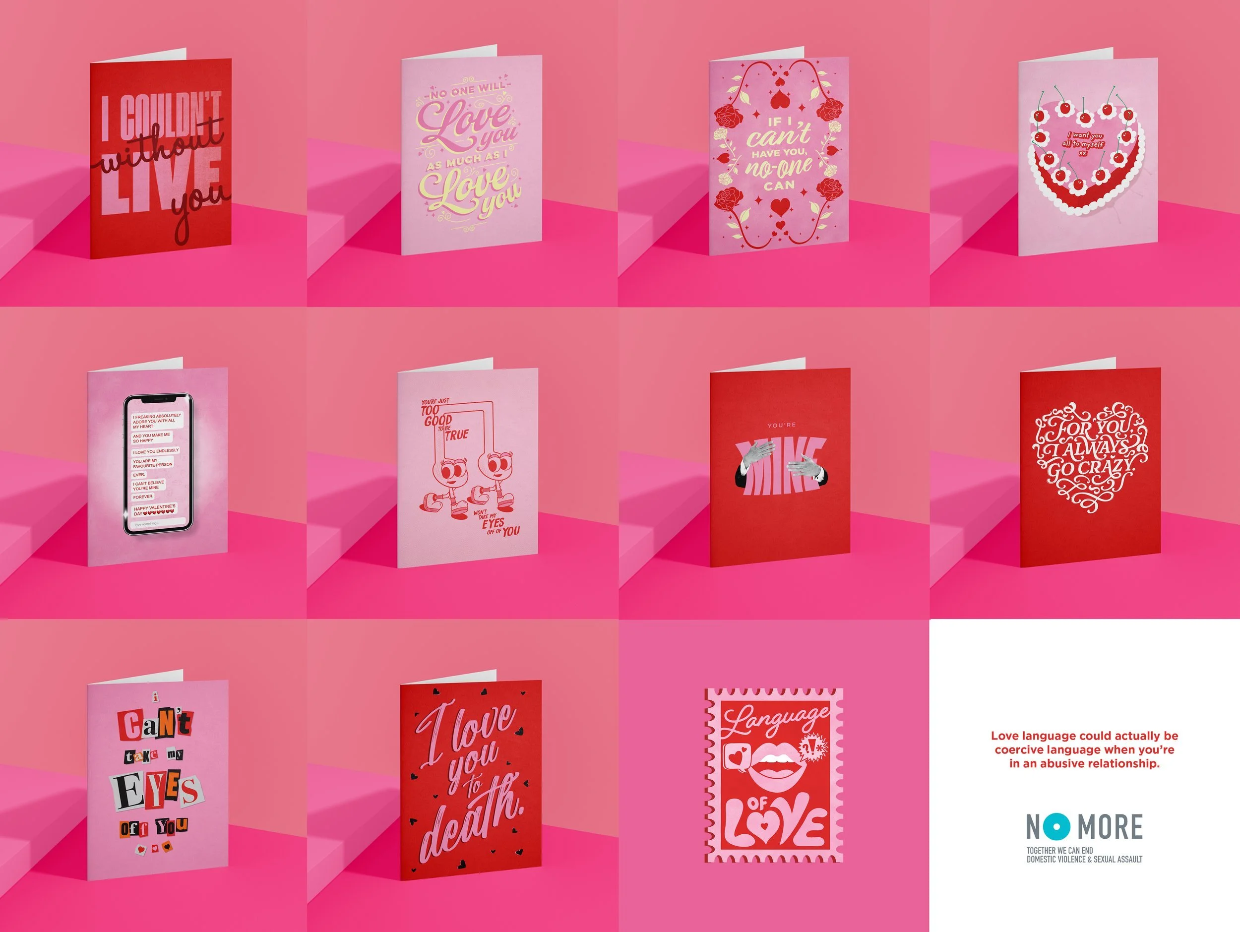 Languages of Love is a project in collaboration with No More organization, a charity dedicated to combating domestic and sexual violence. This Valentine’s Day campaign aims to raise awareness about the use of coercive language through a collection of cards. As a part of a team of designers, we each crafted these cards using Valentine’s Day tropes and a defined colour palette to tie them all together while exploring various styles for the designs themselves.